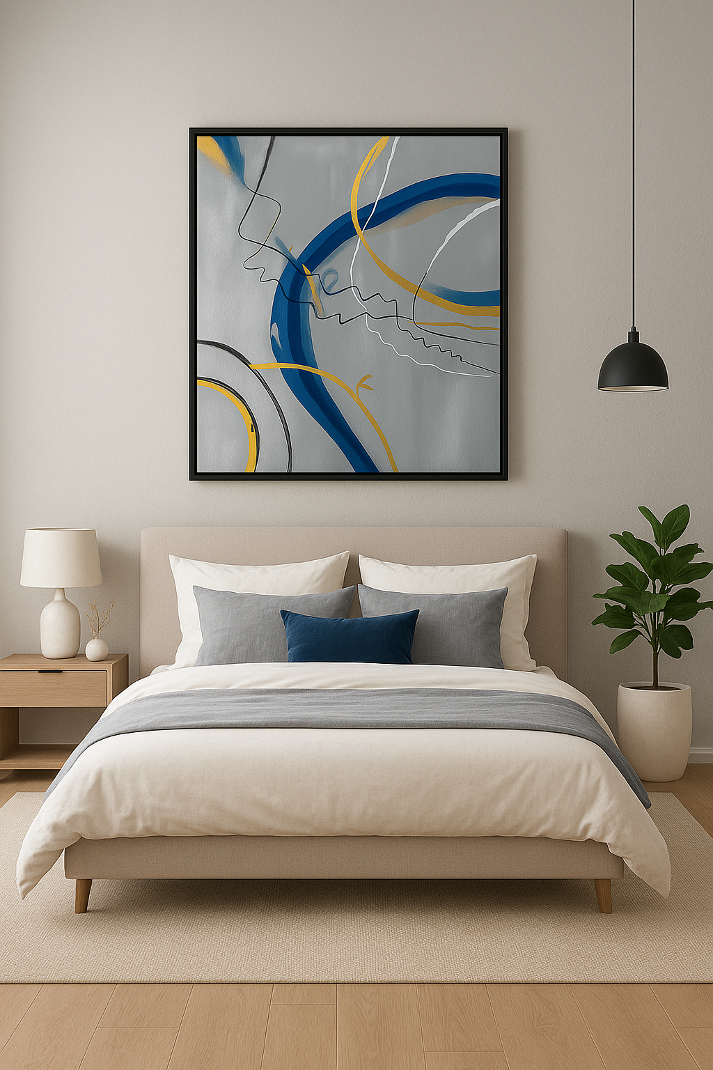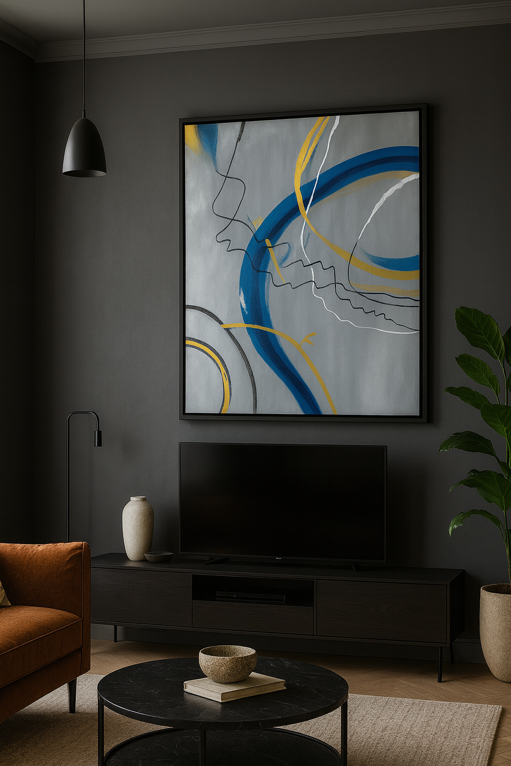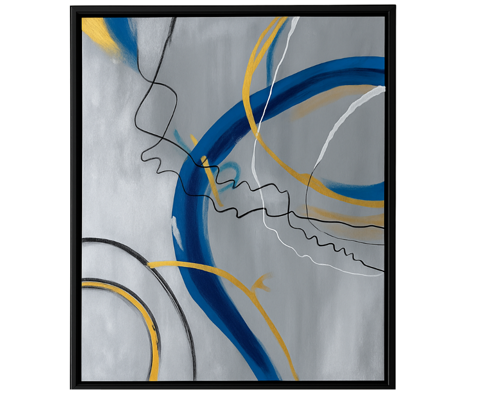 Golden Flux is a contemporary abstract painting featuring bold arcs in deep blue, gold, and black over a sleek grey background. With dynamic motion and minimalist elegance, this artwork is perfect for modern interiors seeking sophistication and creative energy.