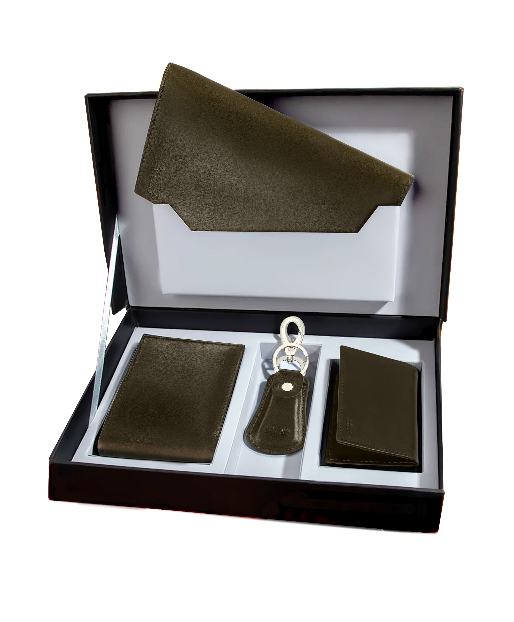 - Includes Men's Wallet, Key Chain, Card Holder & Travel Wallet